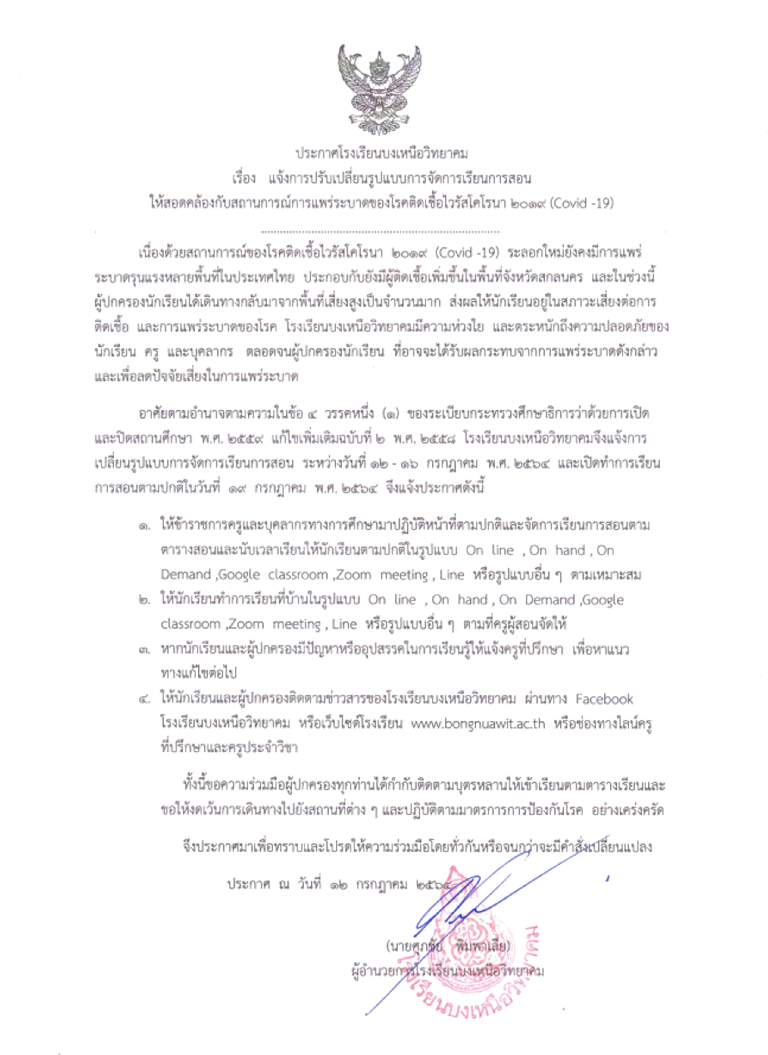 แจ้งปรับเปลี่ยนรูปแบบการจัดการเรียนการสอนให้สอดคล้องกับสถานการณ์การแพร่ระบาดของโรคติดเชื้อไวรัสโคโรนา ๒๐๑๙ (COVID - 19) ฉบับที่ ๒