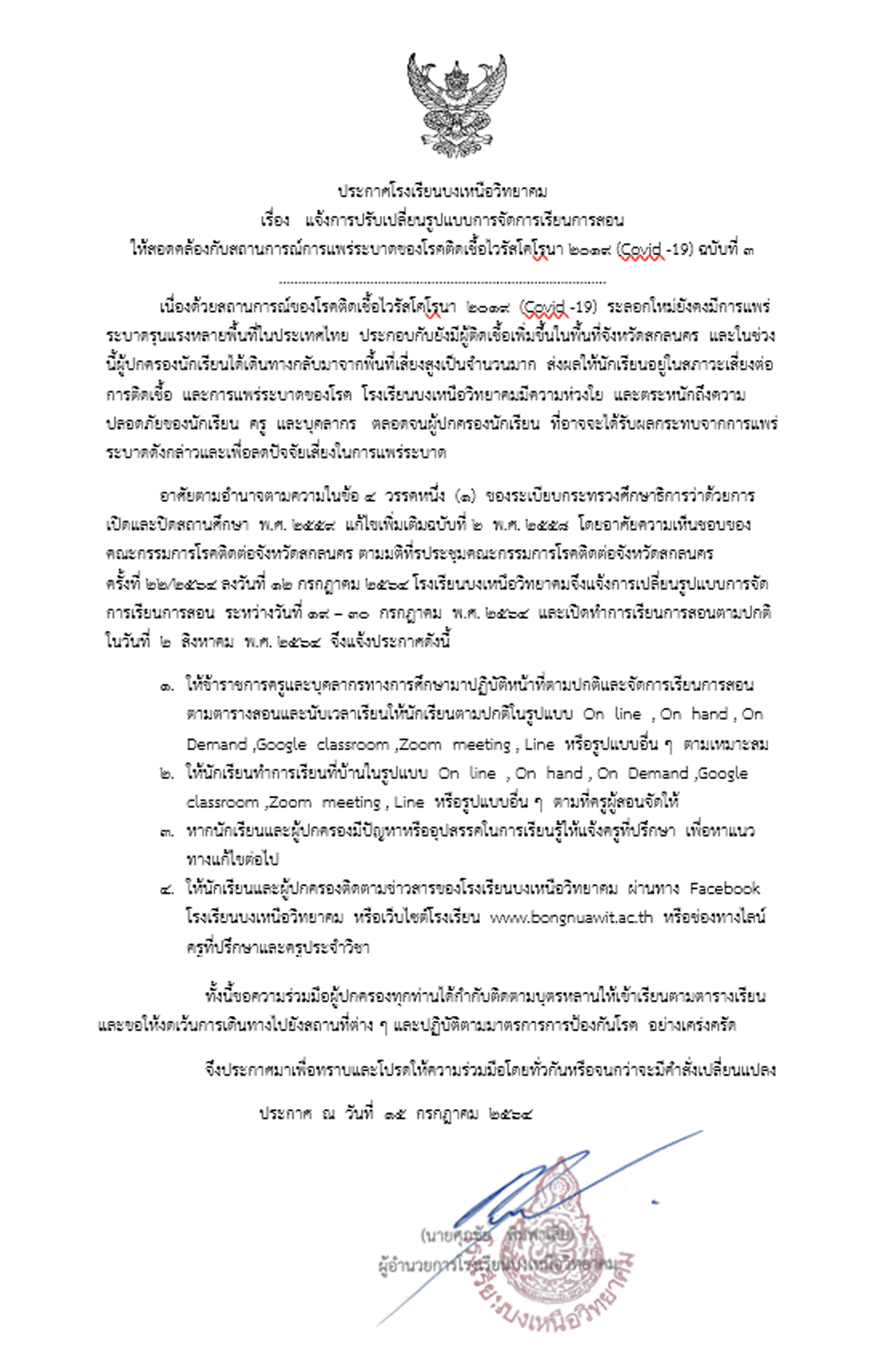 แจ้งปรับเปลี่ยนรูปแบบการจัดการเรียนการสอนให้สอดคล้องกับสถานการณ์การแพร่ระบาดของโรคติดเชื้อไวรัสโคโรนา ๒๐๑๙ (COVID - 19) ฉบับที่ ๓
