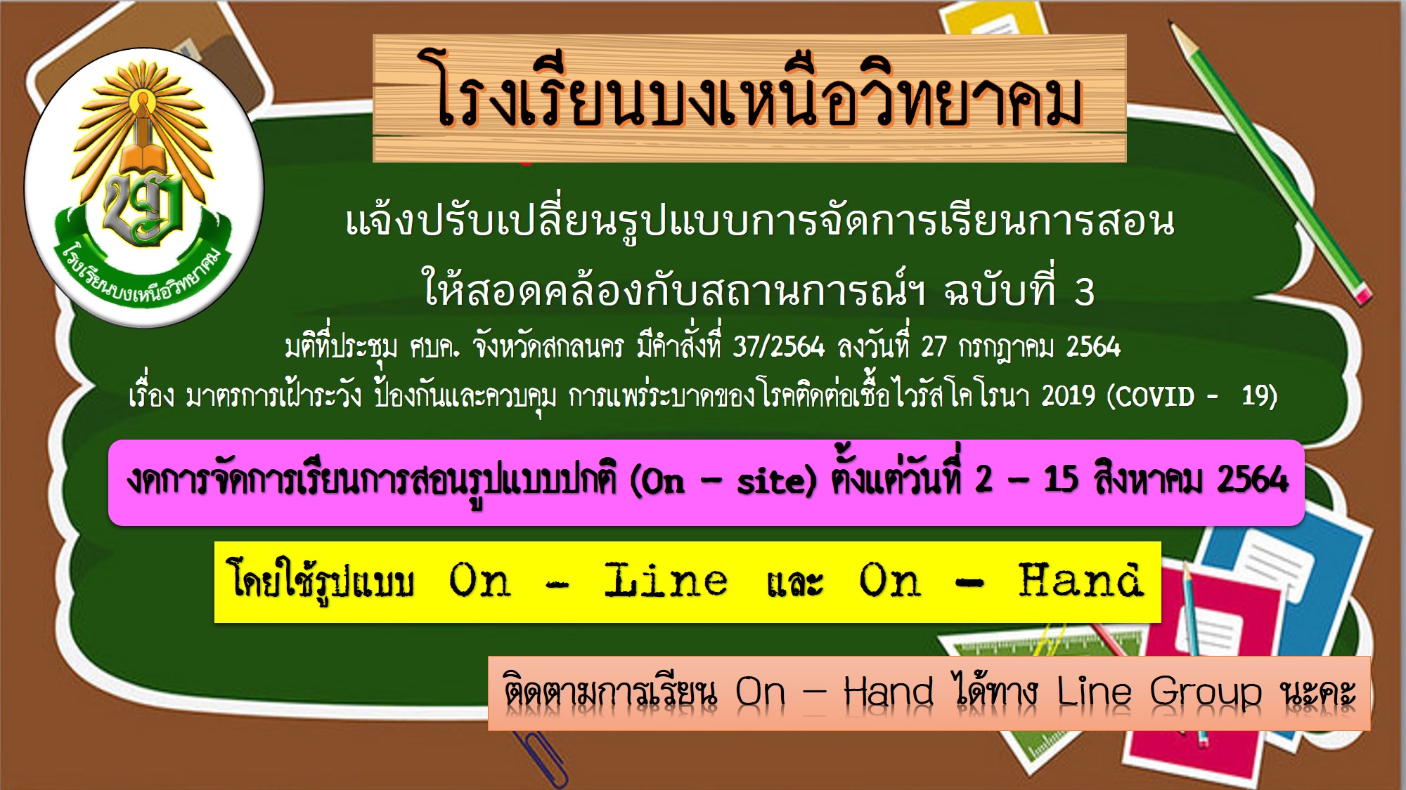 แจ้งปรับเปลี่ยนรูปแบบการจัดการเรียนการสอนให้สอดคล้องกับสถานการณ์การแพร่ระบาดของโรคติดเชื้อไวรัสโคโรนา ๒๐๑๙ (COVID - 19) ฉบับที่ ๔